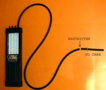 Contents This is what it looks like when you open the box. On the left the Carbtune and rubber hoses. On the right the plastic cable clip to hang gauges from the handlebars and inside the small plastic bag there are 4 x 5mm adapters, 4 x 6mm adapters and one fine bore thick wall clear plastic tube about 8cm (3”) long by 5mm (0.2”) diameter to make the restricters. If ordered with the Toolpouch then the same contents will be packed inside the Toolpouch. |
